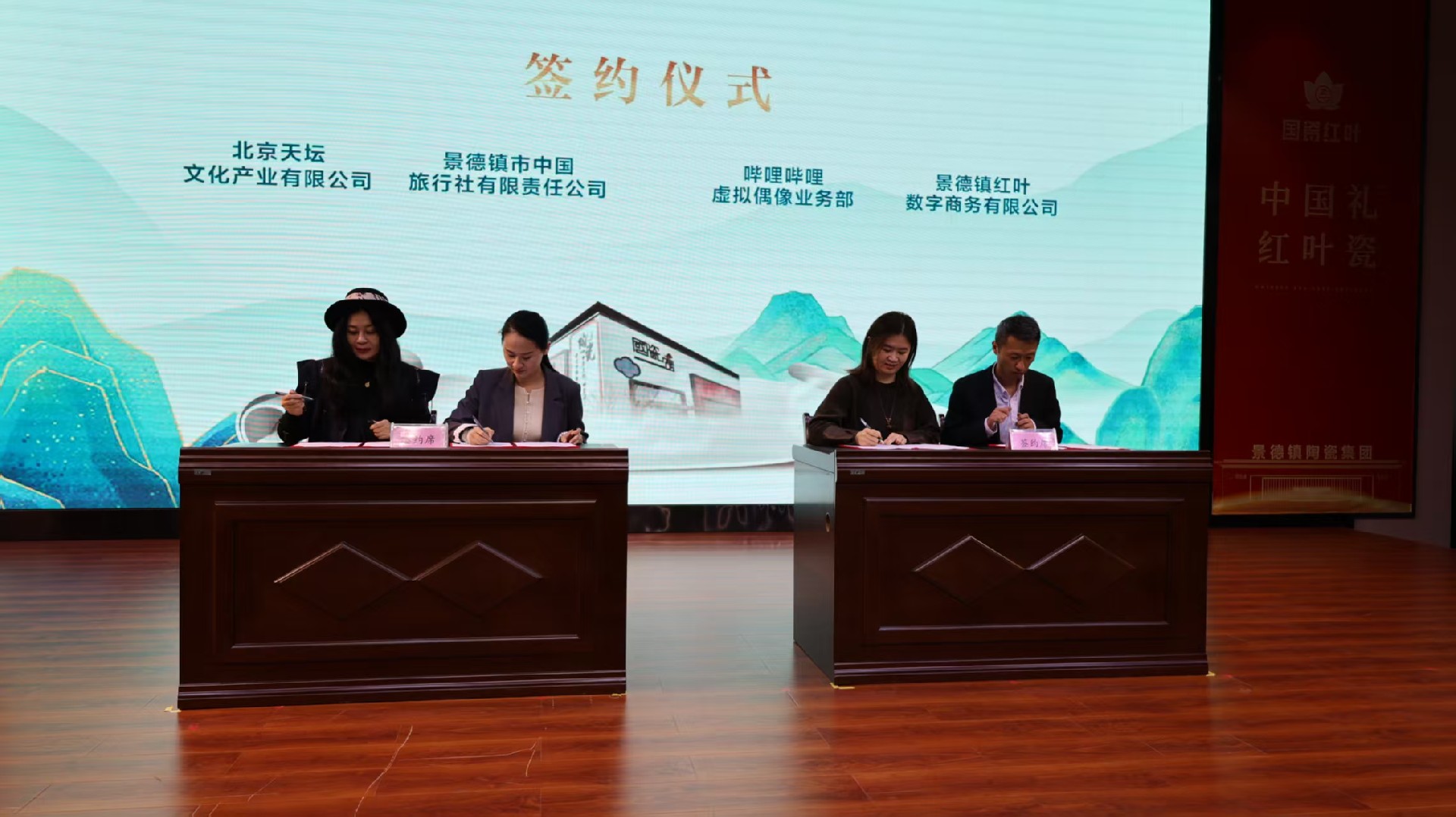 成立大會上,與會嘉賓共同觀看了國瓷紅葉畫院宣傳片,現(xiàn)場頒發(fā)了畫院聘書,并完成了與北京天壇文化產(chǎn)業(yè)有限公司、嗶哩嗶哩虛擬偶像業(yè)務部的合作簽約儀式。