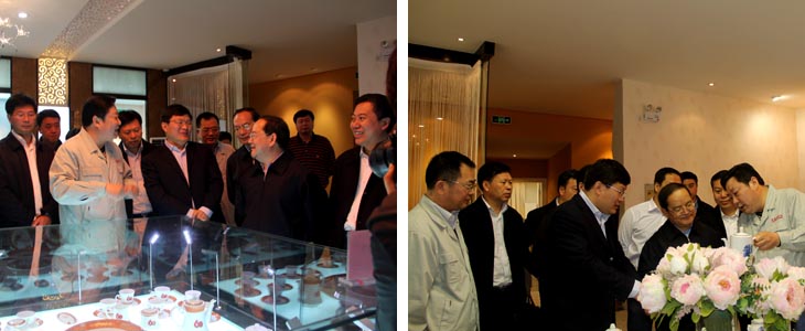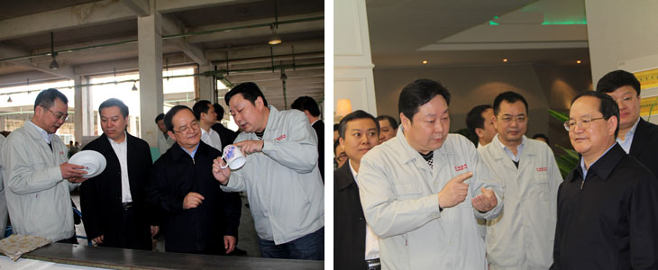 2012年4月6日江西省人民政府省長(zhǎng)鹿心社一行在市委書記鄧保生、市長(zhǎng)劉昌林等省市領(lǐng)導(dǎo)的陪同下來我司視察工作,鹿心社省長(zhǎng)一行參觀了工廠生產(chǎn)車間、國(guó)瓷館,詳細(xì)了解了公司的生產(chǎn)運(yùn)營(yíng)情 況并對(duì)公司產(chǎn)品贊不絕口。視察期間,鹿心社省長(zhǎng)對(duì)公司給予了高度評(píng)價(jià):“你們公司為景德鎮(zhèn)爭(zhēng)了光,為江西爭(zhēng)了光,為國(guó)家爭(zhēng)了光。"并希望公司能牢牢抓住精品路線,抓住高端市場(chǎng),搞活機(jī)制,繼續(xù)做的更大更好。