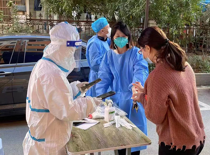 劉靚是綠葉小區(qū)7棟樓棟長(zhǎng),每天凌晨起來(lái)的第一件事情就是查看樓群信息,看看有沒有需要特殊關(guān)照的住戶,為他們提供個(gè)性化的需求等,同時(shí)負(fù)責(zé)社區(qū)居民采購(gòu)物資分發(fā)。每天當(dāng)三歲的女兒還在睡夢(mèng)中時(shí),她已經(jīng)到核酸檢測(cè)點(diǎn)穿上防護(hù)服、帶好口罩和手套,開始了一天的全員核酸檢測(cè)工作。她負(fù)責(zé)在進(jìn)口引導(dǎo)前來(lái)檢測(cè)的居民有序排隊(duì)、掃碼、打開贛通碼,并保持一米的間隔,提醒大家做好防護(hù),讓居民快速、安全、有序的完成核酸檢測(cè)流程。全員核酸檢測(cè)志愿工作往往都是一站就是一上午,6小時(shí)下來(lái),從來(lái)沒有聽她叫苦叫累,配合社區(qū)工作人員一起收拾完核酸采集物資才最后離開。